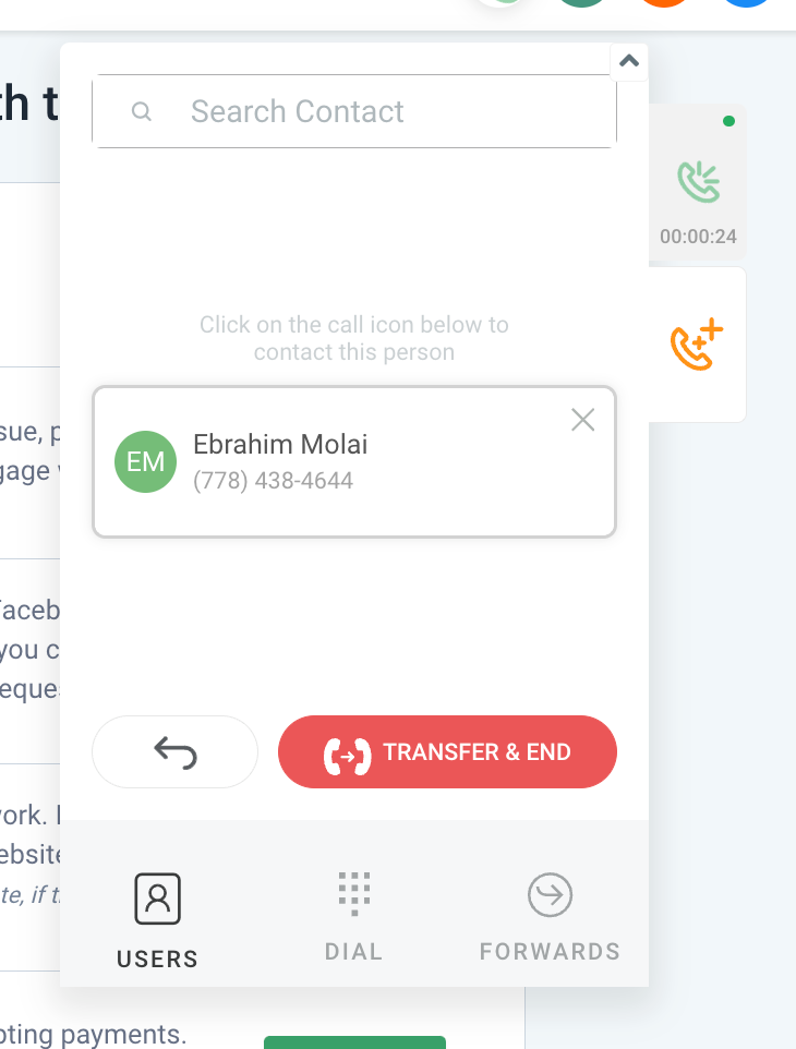 Una transferencia en caliente se produce cuando llamas a otro usuario y le pides que transfiera la llamada. Puedes buscar a otro usuario o marcar manualmente otro número. Esto abrirá una segunda llamada y podrás alternar entre ellas.