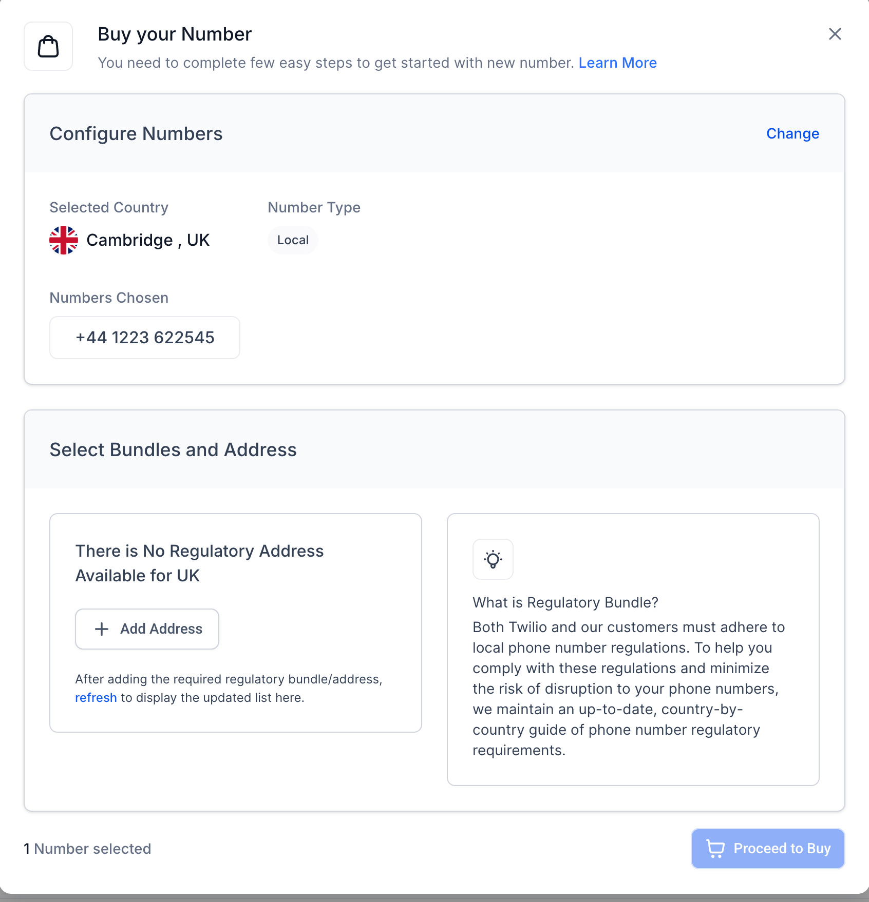 En la mayoría de los países fuera de Estados Unidos y Canadá , se requiere un paquete regulatorio o una dirección al comprar números de teléfono .