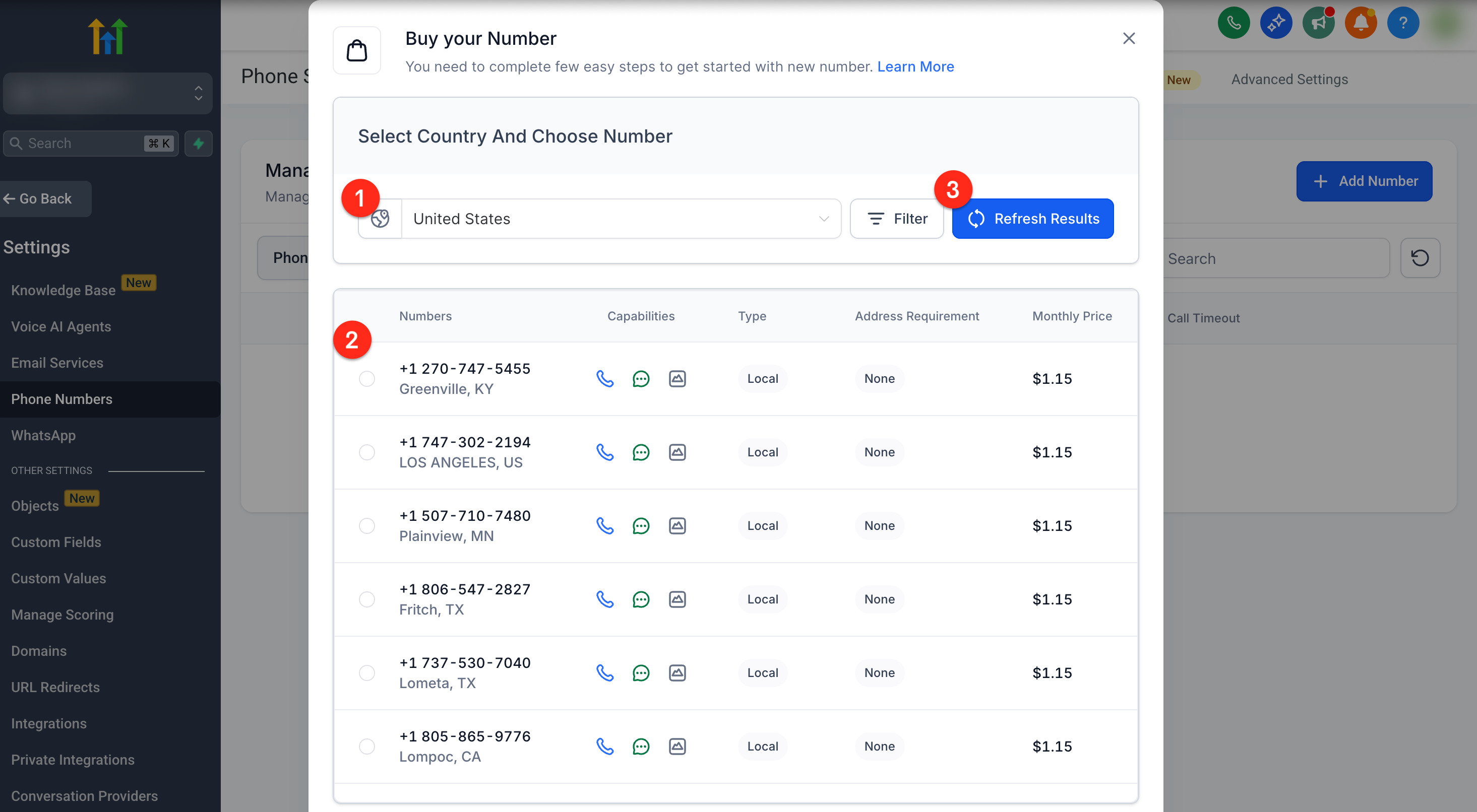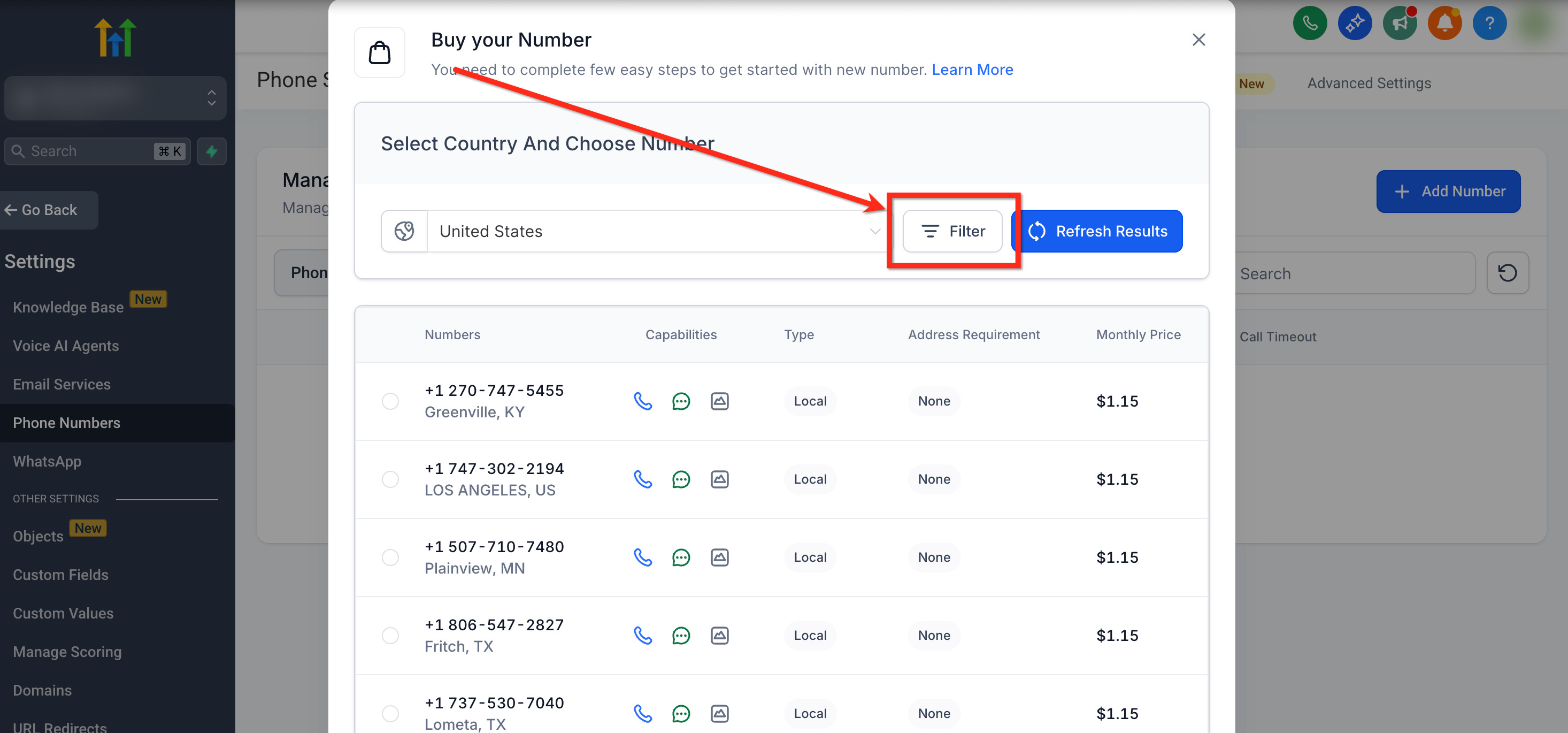Si no encuentra números disponibles en su código de área preferido, actualice los resultados para ver nuevas opciones. La disponibilidad de números de teléfono cambia con frecuencia. También puede buscar con filtros más amplios o códigos de área cercanos.